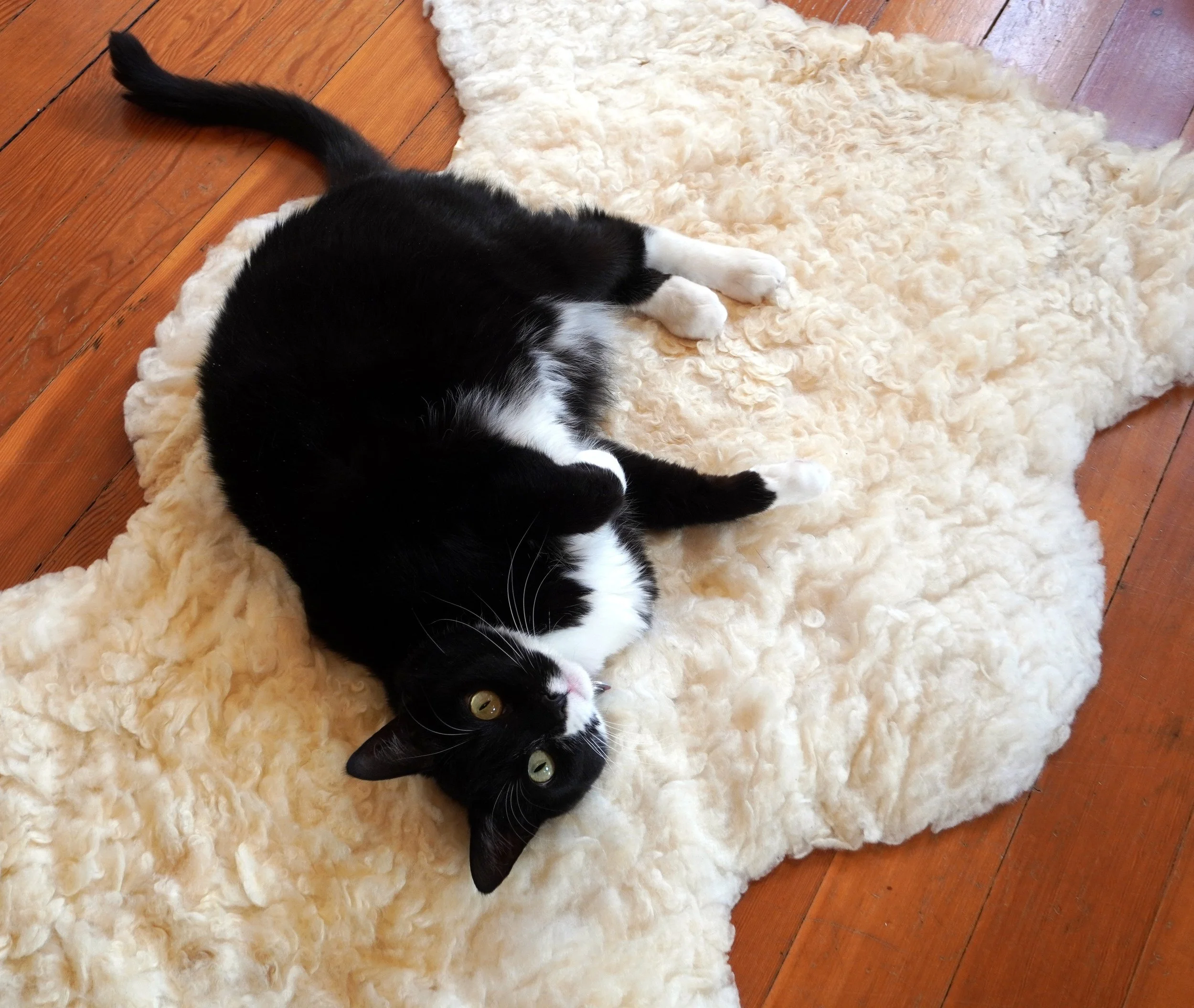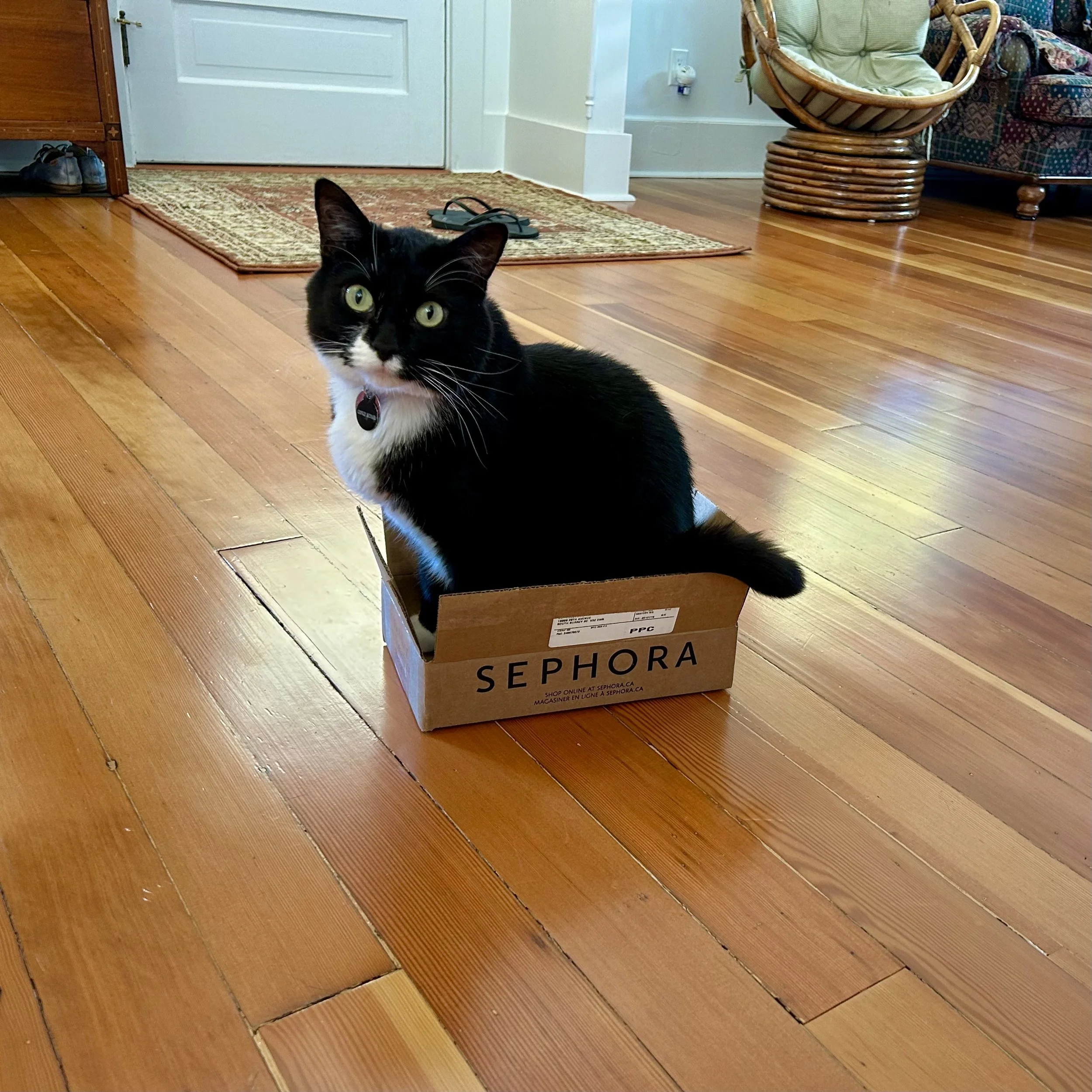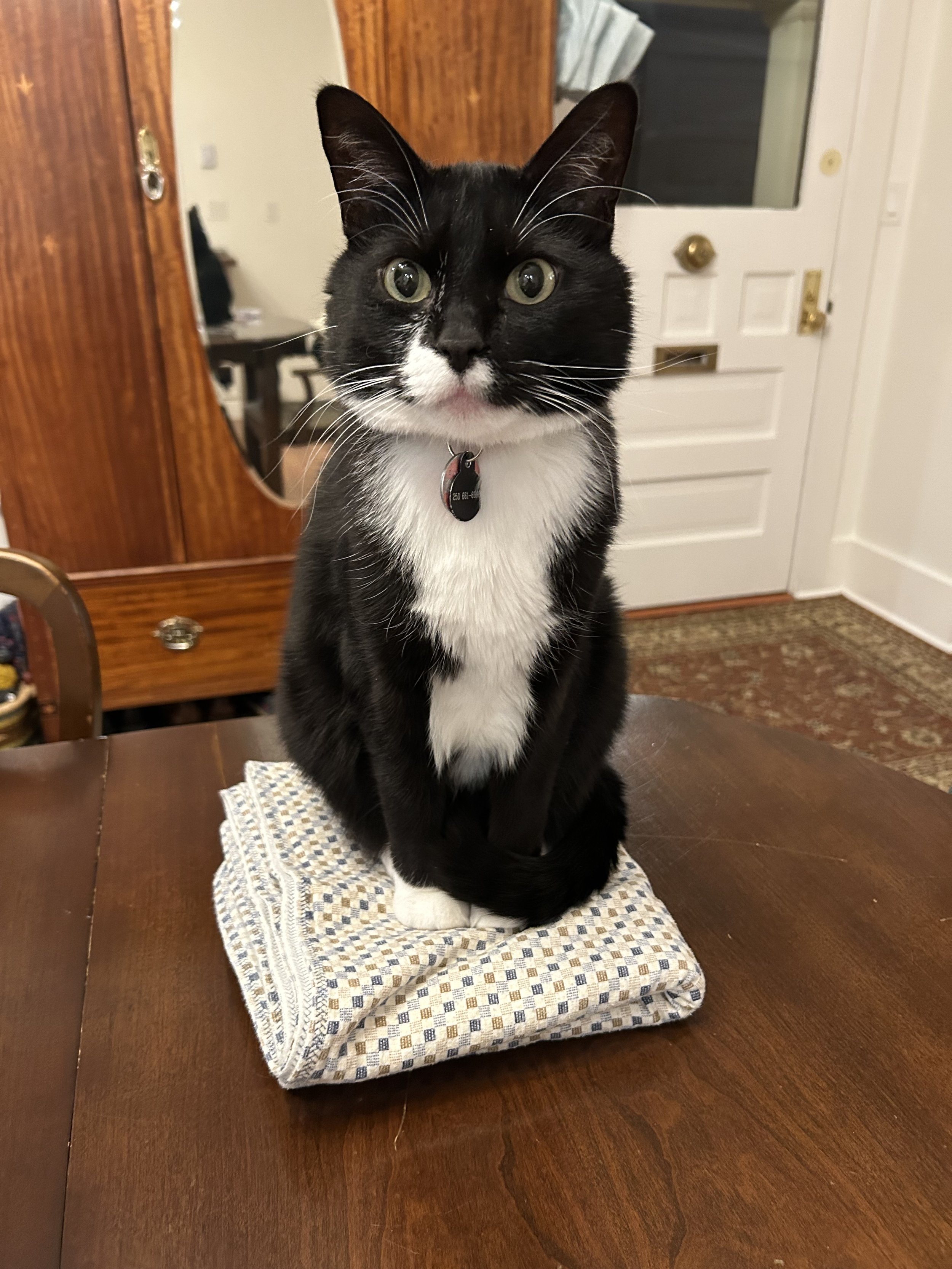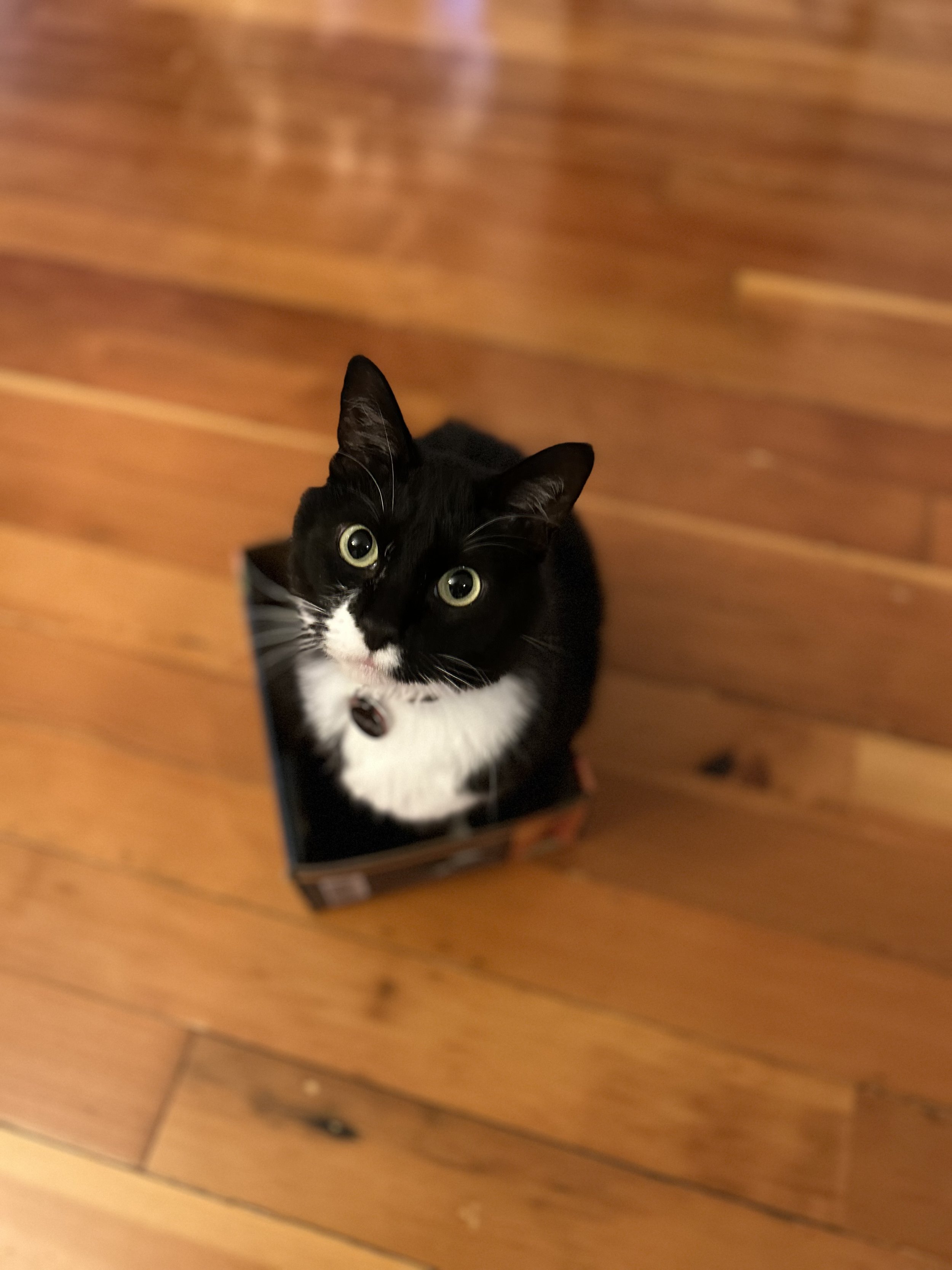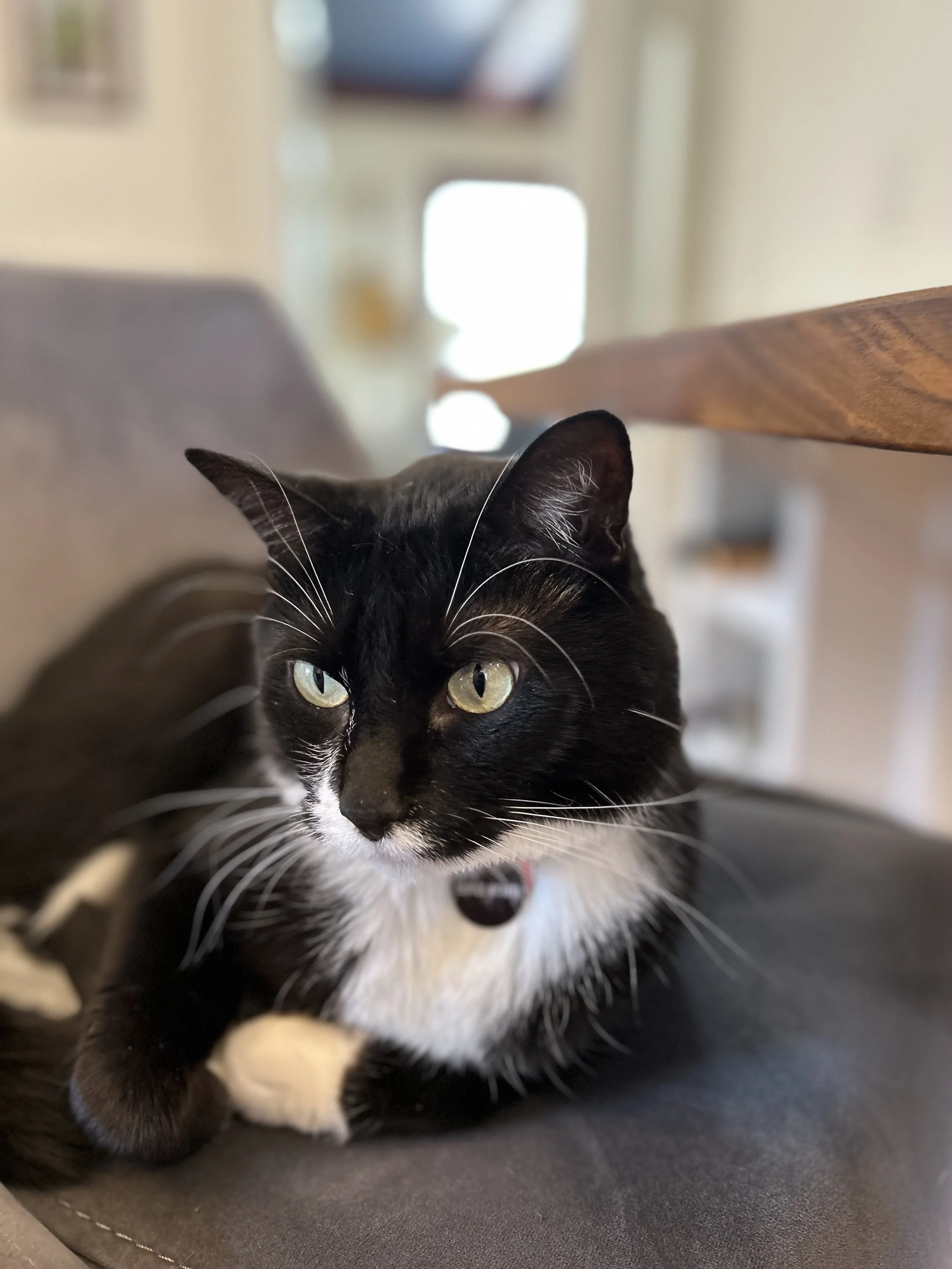 George Michael is a tuxedo cat, who loves being brushed while eating breakfast, hunting his stuffed toy cat every evening and bringing it to bed as a gift, anything tuna related, licking the handles of canvas bags, and coiled up pipe cleaners.